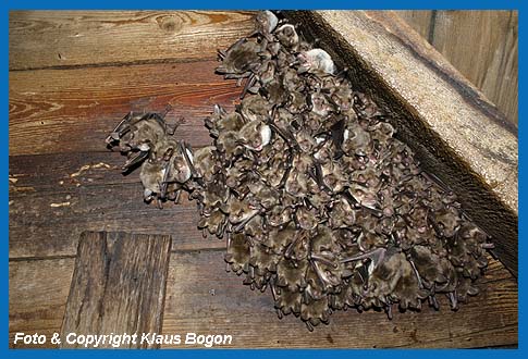Kleine Wochenstube mit Jungtieren. Große Mausohren-Wochenstube im Kirschturm