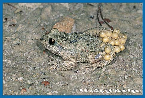werden. Die Eier sind durch sich verfestigende Bänder miteinander verbunden. Durch Strampel- bewegungen schlingt sich das Männchen die Eier um die Fersen- gelenke und werden von nun an vom ihm getragen. Die