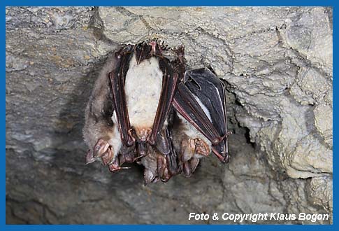 An der Höhlendecke hängendes kluster  Gr. Mausohren Kleines Kluster schlafender Großer Mausohren.