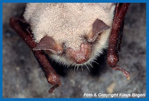 Porträt ein mit Tau benetztes Großes Mausohr. Porträt  eines winterschlafenden, stark mit Tau benetzten, Großes Mausohr.